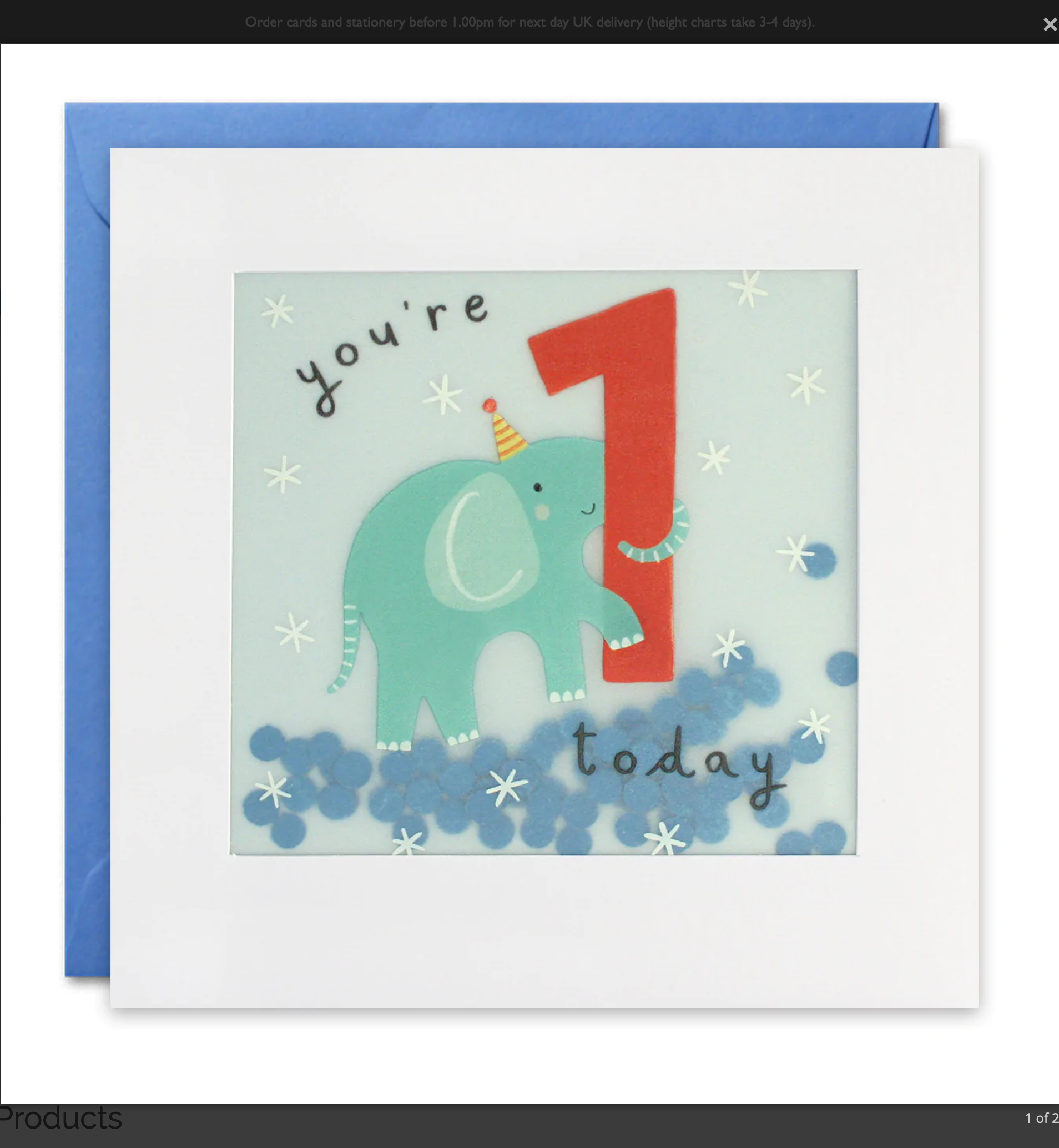 A colourful age 1 card illustrated by Katherine Hartley. The image on the front shows an elephant wearing a party hat, next to the number 1 on a pale blue background with stars.
