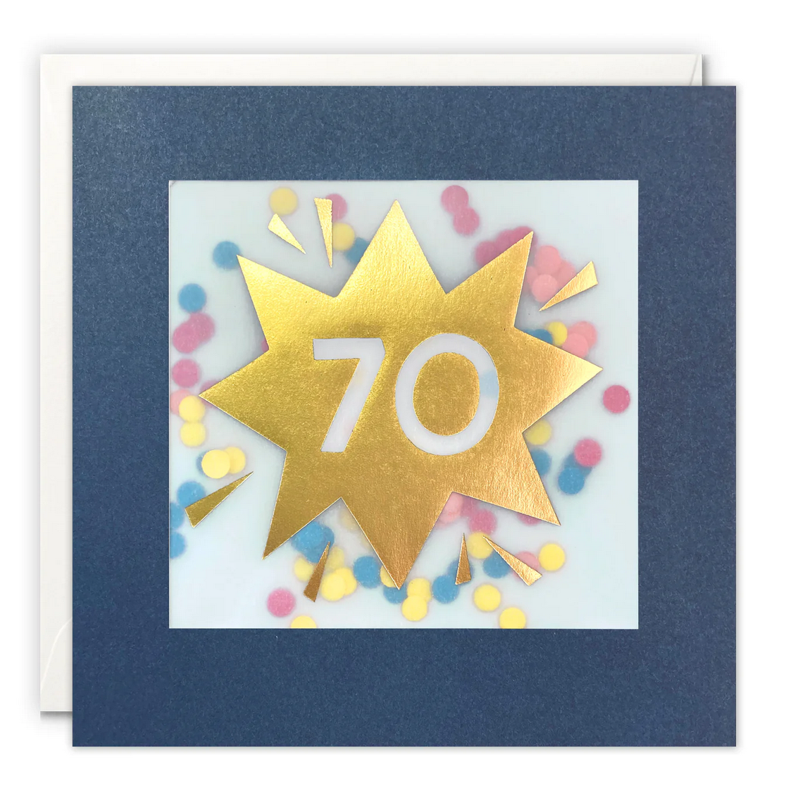 A high quality age 70 card illustrated by Kate Mainard. The image on the front features a large star shape foiled in gold, with the number '70' in the middle.