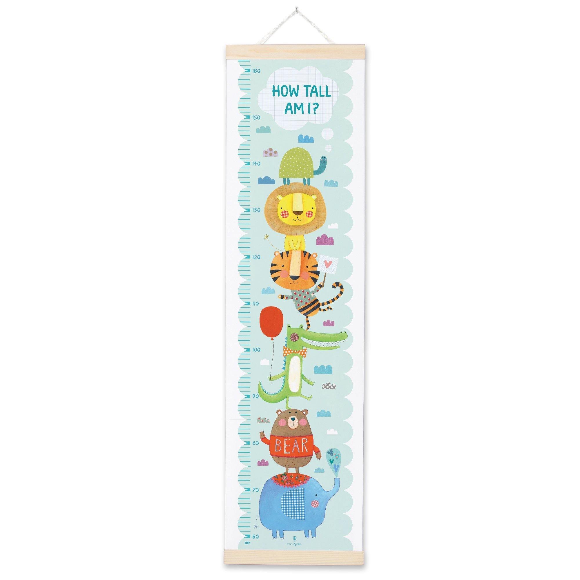 A high quality canvas height chart with wooden hangers, illustrated by Julie Fletcher. The height chart features a tower of colourful wild animals on a blue background, with a thought bubble reading 'How tall am I?'. The measurements on the side of the chart start at 60cm and go up to 160cm.