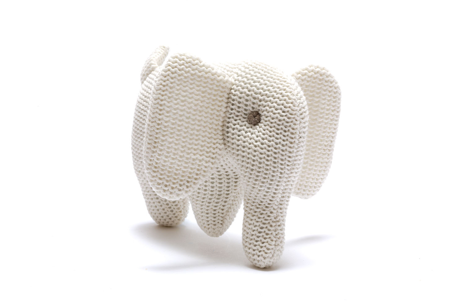 Sweet little elephant baby rattle with floppy ears, long trunk and little tail. This elephant toy is in white is knitted from 100% organic cotton. This would be an ideal first rattle for a new baby gift UK.