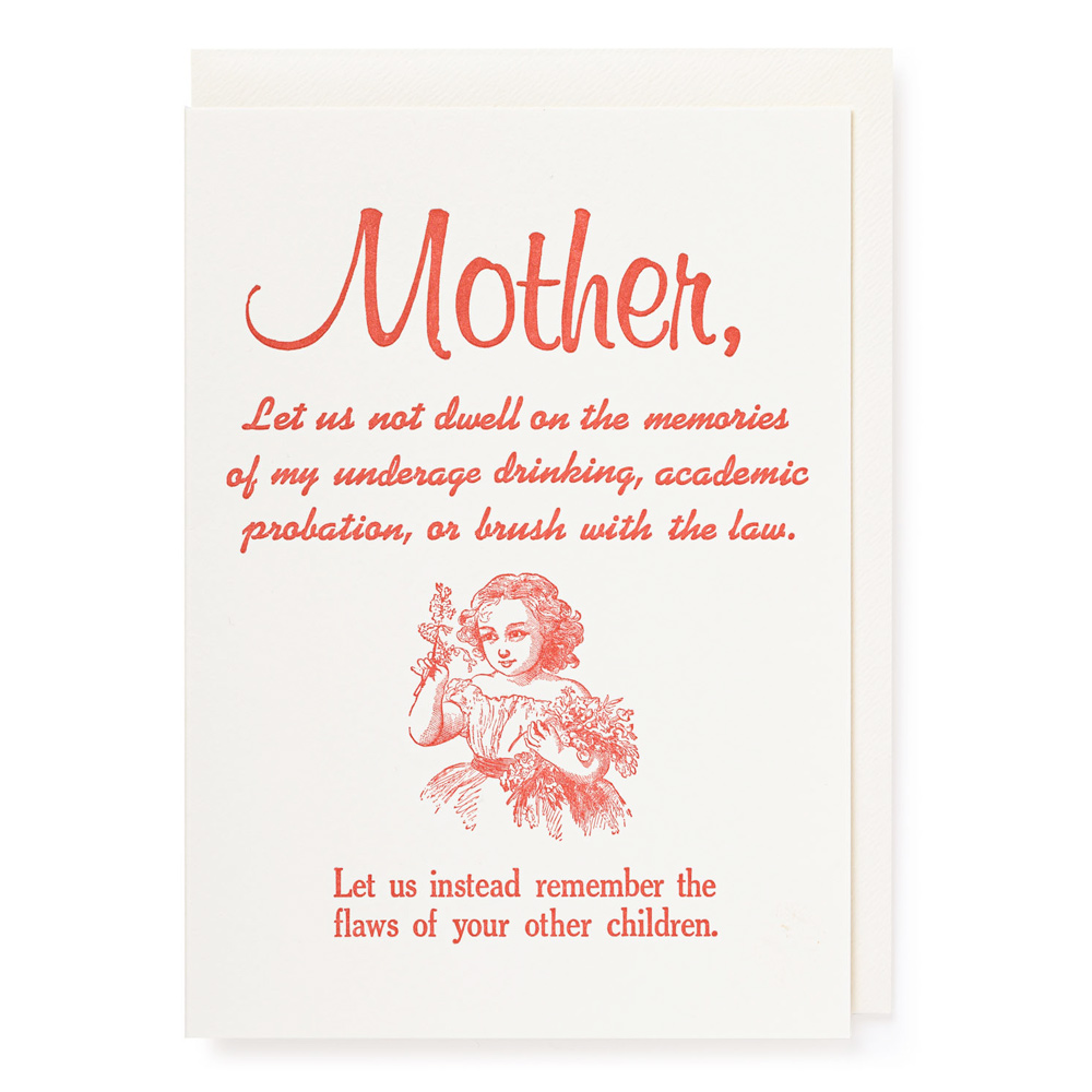 Mother, Let us not dwell on the memories of my underage drinking, academic probation, or brush with the law. Let us instead remember the flaws of your other children.